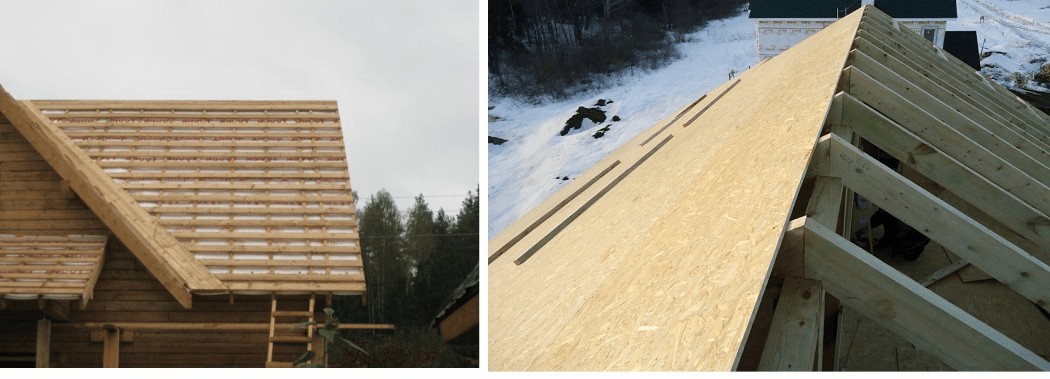 Слева показана разреженная обрешётка под металлочерепицу, а справа — сплошная