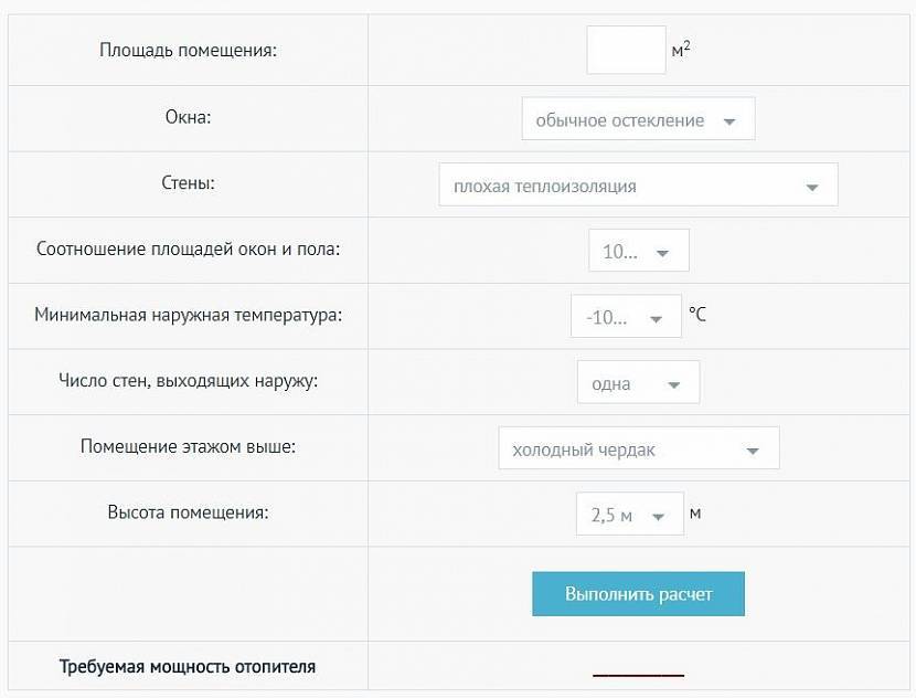 Калькулятор расчета необходимой тепловой мощности для отопления помещений