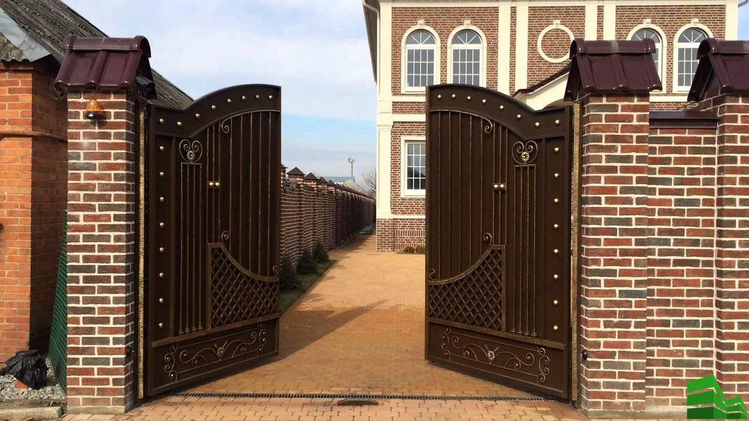 Другой тип ворот — это металлические распашные ворота на две створы с применением художественного оформления и (или) облицованные крашенным профлистом. Полы ворот имеют облегченный вид, а вход (калитка) выполнен рядом с ними.