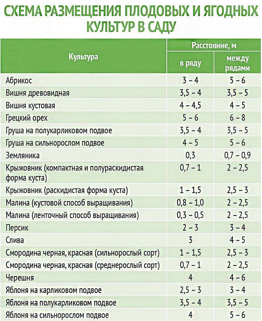Расстояние между деревьями, которые в равной степени хорошо развиваются как на солнце, так и в тени, должно составлять 2-3 м (2,5 м). В среднем для большинства плодоносных пород достаточным является удаление на 5-6 м, а низкорослые растения рекомендуется сажать на расстоянии 1-2 м (чем ниже кустарник, тем ближе располагается).