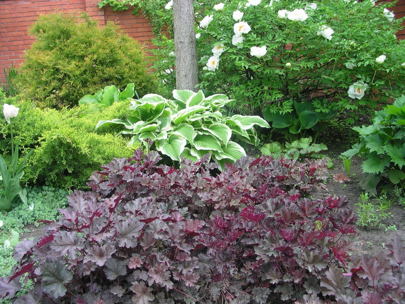 При создании композиции из этих культур важно учитывать, что гейхера вырастает в высоту до полуметра, поэтому ее можно садить в различных комбинациях с низкорослой хостой. Если же выбор пал на крупные и рослые хосты (от 80 см до метра), то их всегда нужно высаживать на задний план, чтобы гейхера не потерялась в их кустах