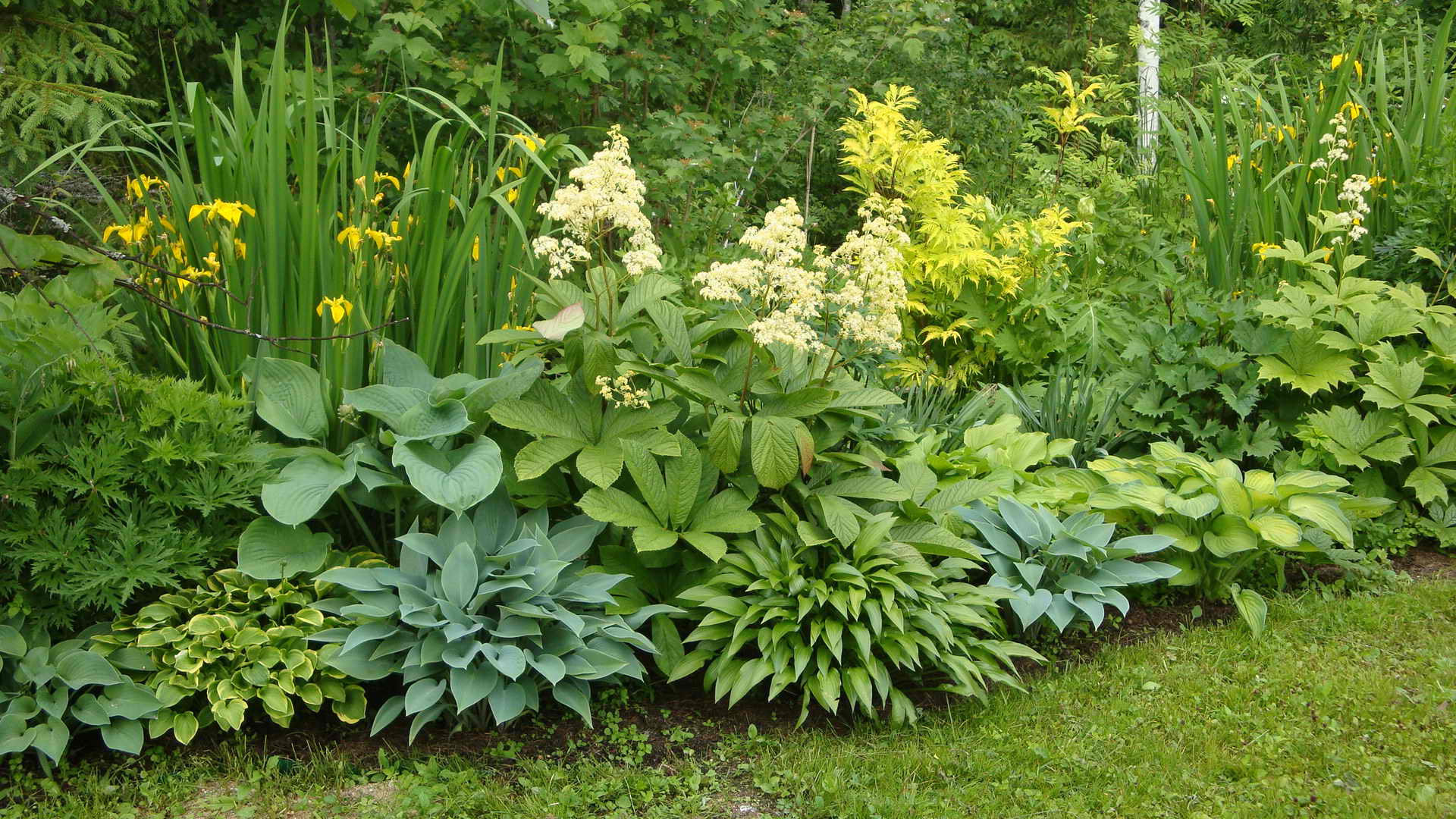 На тёмных и сырых участках можно посадить астильбу арендсу, чистоус великолепный, бадан сердцевиднолистный, ожику лесную.