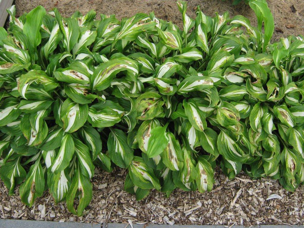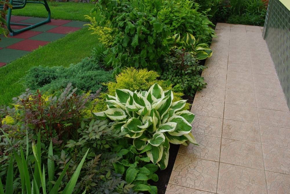 Главный аспект успешности данного решения – чем разнообразней, тем лучше. Создавайте из них настоящую мозаику, она наверняка захватит и поразит гостей. И пусть не отпугивает асимметричность – в этом шарм сада хост. Высадку следует осуществлять максимально плотно, но чтобы хосты не мешали росту и развитию друг друга. Периметр этого участка сада стоит подчеркнуть дорожкой ил тротуарной плитки или отсыпкой гальки, щепы. Учитывайте размер листьев в развернутом виде, сделав бордюрчик или отсыпку, слишком быстро рискуете его потерять уже в средине лета, когда хоста раскроет свои листья в полном масштабе.