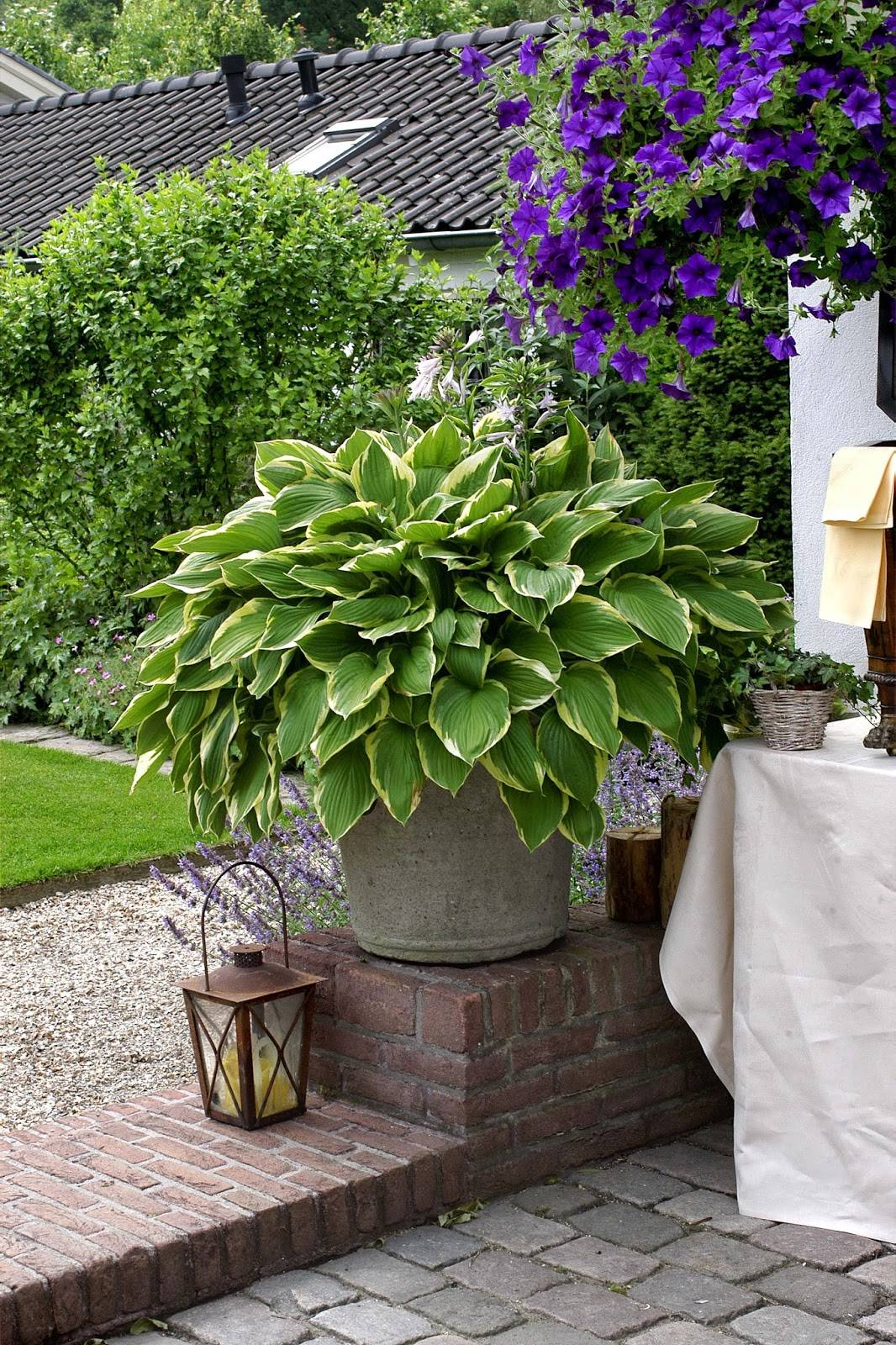 Еще одно оригинальное решение – разместить хосты в горшках, но они должны быть большими и вместительными. Для посадки стоит использовать только компактные, низкорослые сорта. Сделав такую мобильную посадку, вы сможете перемещать ее в необходимое место, для заполнения пространства. Придать объема смогут остролистые окаймленные хосты.