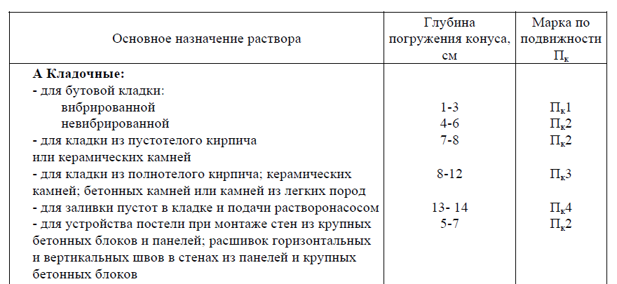 Приблизительный расход воды в СП82-101-98 показан для смеси с подвижностью П3 (9-10см глубина осадки конуса). Данная подвижность по ГОСТу 28013—98 подойдет для кладки из полнотелого кирпича и керамических камней. Расход воды для другой подвижности смеси определяется в результате пробных замесов. Выбрать нужную нам подвижность в зависимости от назначения раствора можно по таблице, представленной в ГОСТе 28013-98
