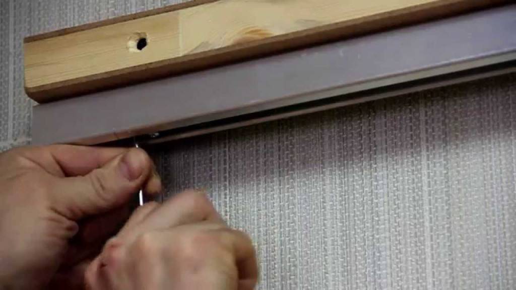 В нижней поверхности бруса крепим рельс, сначала не слишком плотно. Проверяем ровно ли он установлен и достаточно ли пространства между дверью и стеной, затем закрепляем окончательно.
