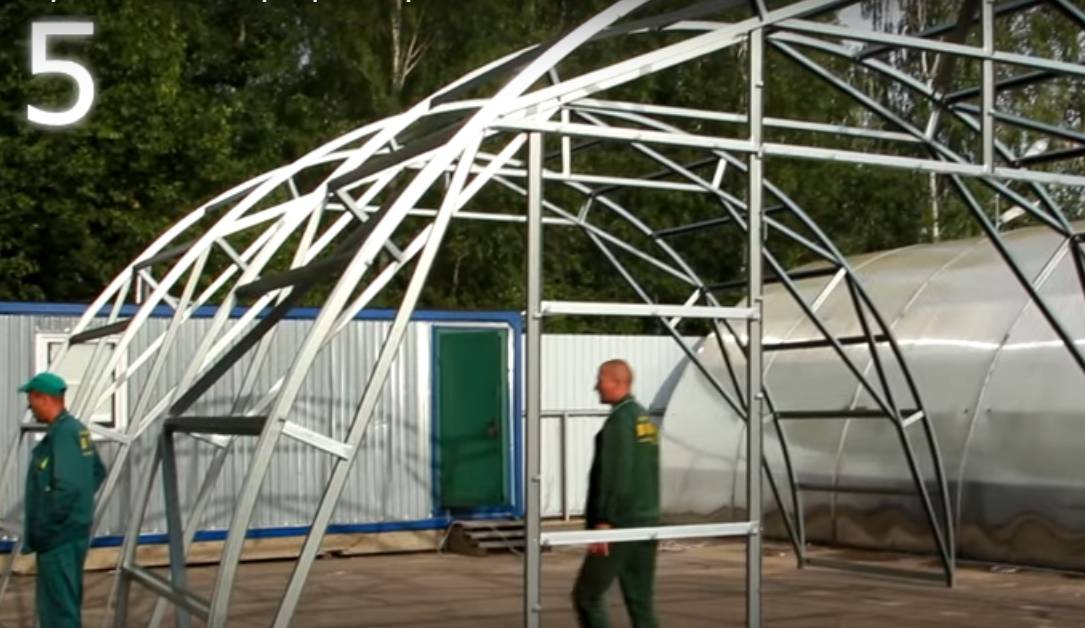 Шаг 4. Из фронтона, промежуточной арки и прогонов собирается первая секция теплицы, которая впоследствии устанавливается на фундамент.