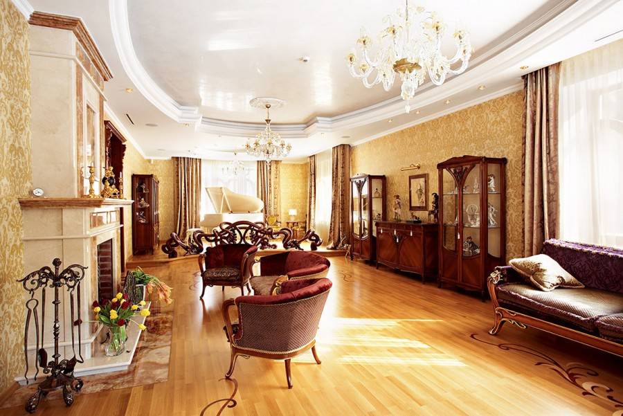 Оформлению потолка в классическом интерьере уделяют большое значение. В гостиной будет уместна лепнина и роспись. Роспись обычно выполняется растительными или цветочными мотивами