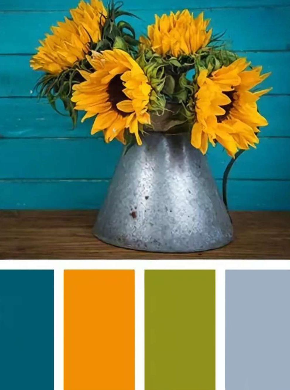 В Пинтересте много картинок, где собраны гармоничные сочетания цветов. Это помогает подобрать палитру, но не всегда самую удачную для конкретного интерьера. У меня вышел прокол с сочетанием голубой — желтый — серый, поэтому цвета пришлось корректировать уже в процессе | Пинтерест — кладезь идей для интерьера. Там мне попалась вот эта картинка, и одно окно я тоже покрасила в желтый цвет |