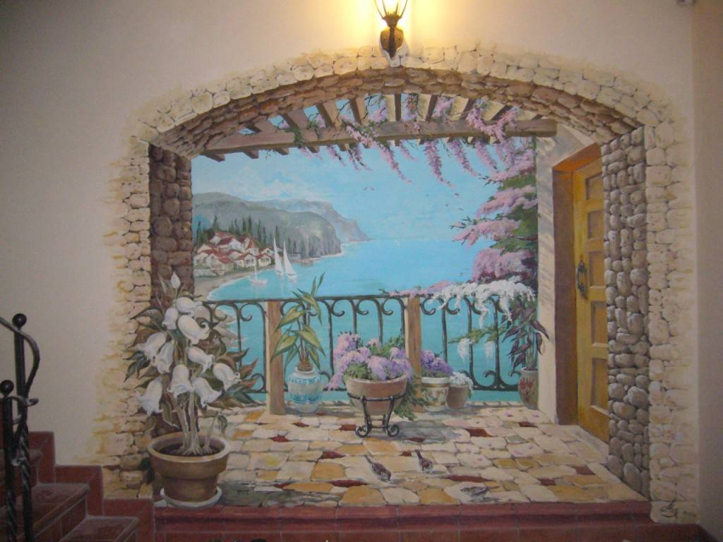 Эта простейшая технология переноса картины на стену, при которой понадобятся навыки и талант художника. Роспись можно заказать профессионалу, заранее ознакомившись с его работами. В этом случае можно будет выбрать наиболее подходящий эскиз и даже вносить изменения в процессе работы.