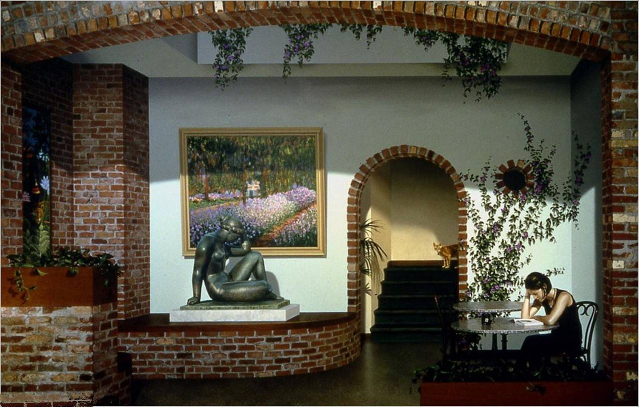 Небольшие рисунки с эффектом прорыва пространства стали излюбленным декором в стиле модерн. В просторных помещениях используются более масштабные природные или городские пейзажи.
