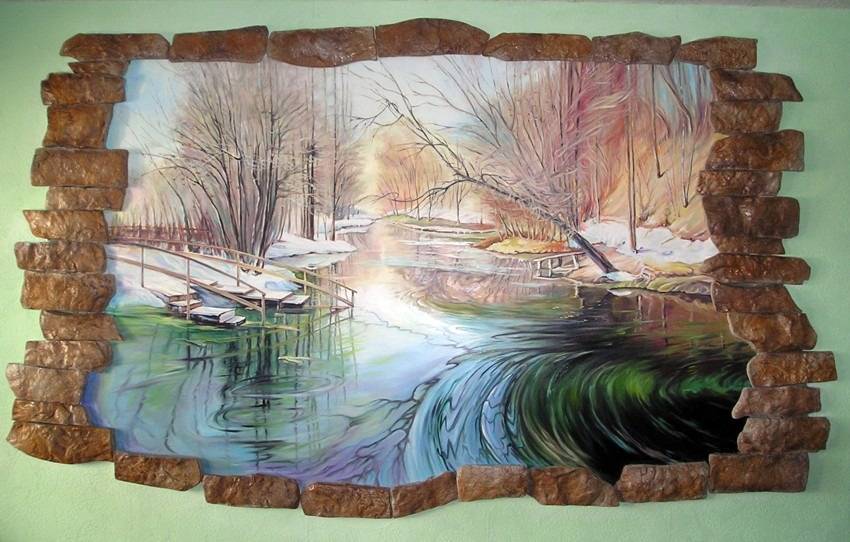 Рисунки 3д популярные в уличной живописи, постепенно осваиваются и в оформлении внутренних стен.