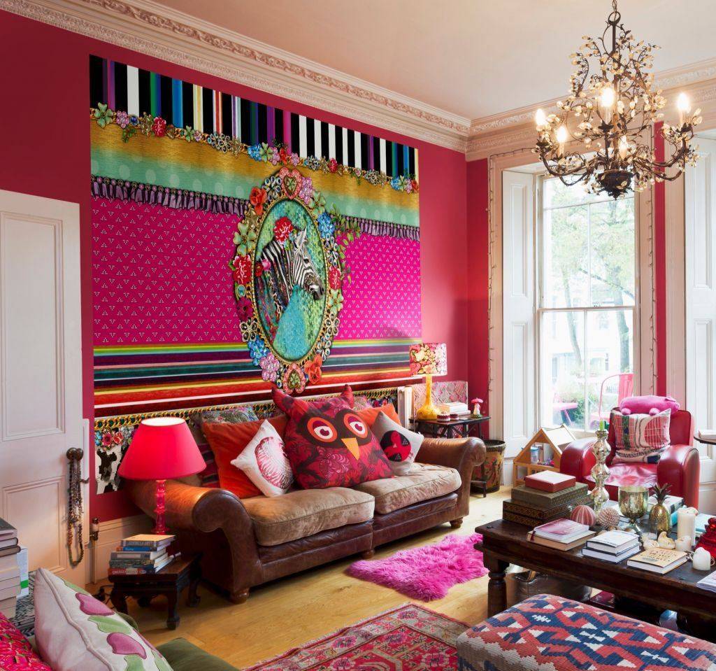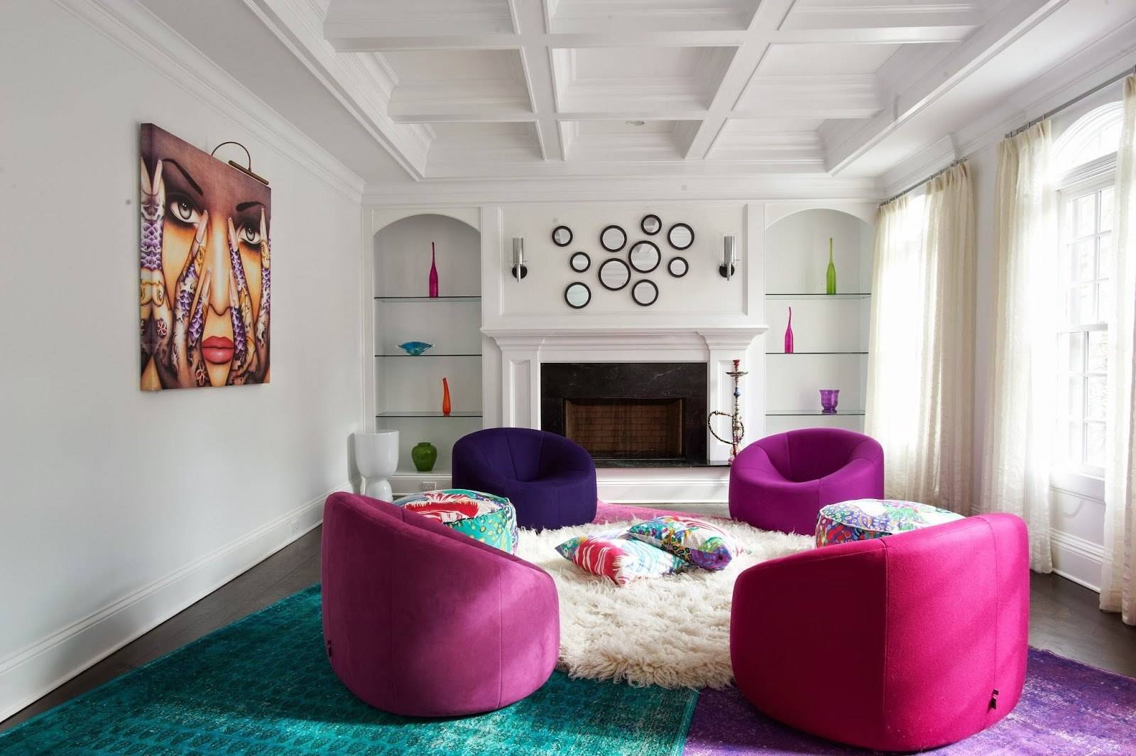 В этнических интерьерах эти оттенки хорошо сочетаются с золотым, фиолетовым, бирюзовым и зеленым. Здесь в малиновый можно покрасить целую стену или ее часть и нанести на нее сложный узор. Великолепно смотрится текстиль в розово-фиолетовой гамме: яркие шторы, подушки, покрывала, половики.