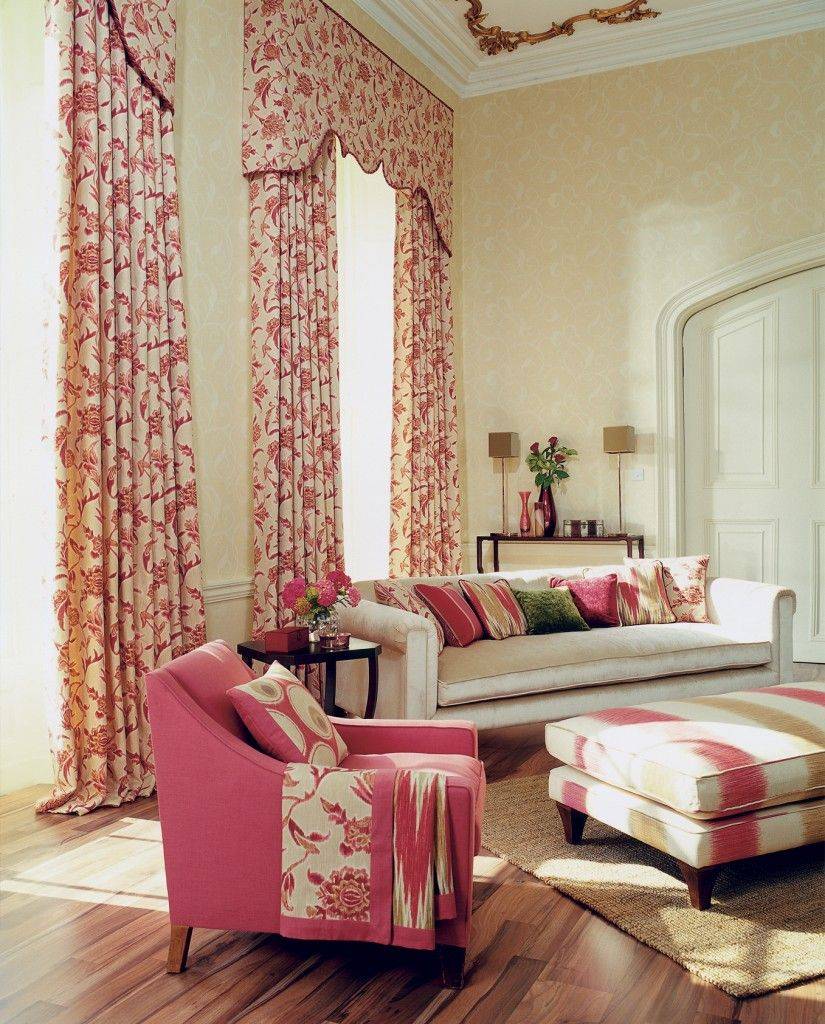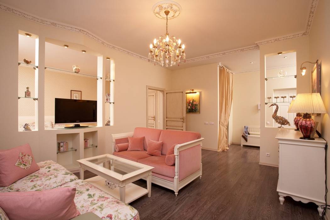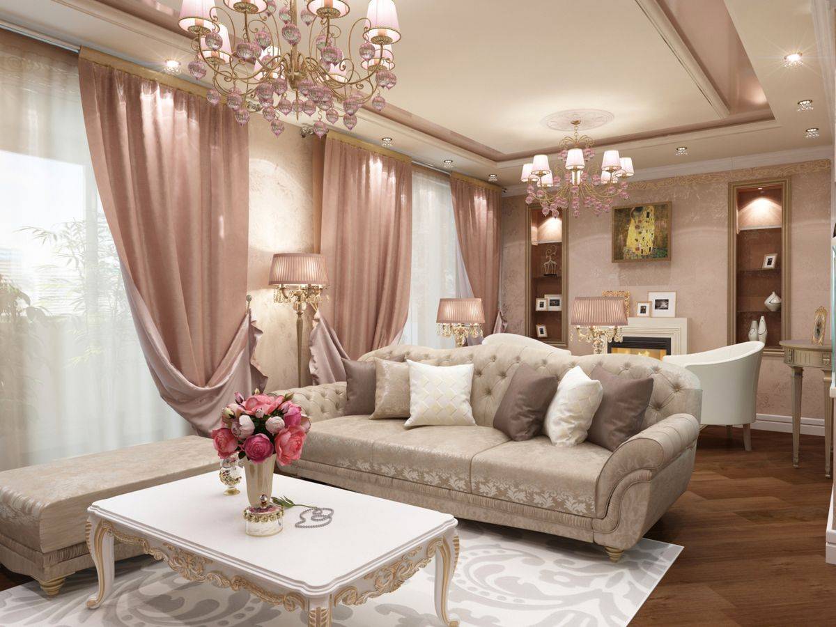 Оптимальным решением считается создание в гостиной фона холодного розоватого цвета с дополнением его мебелью древесных, серых, белых, бежевых оттенков. Если стены более яркие, остальная обстановка должна быть контрастной и максимально светлой. В индийском стиле в гостиной комбинируют розовый и оранжевые цвета. Для придания аристократичности оттенок розы сочетают с лавандовым, мятным тонами.