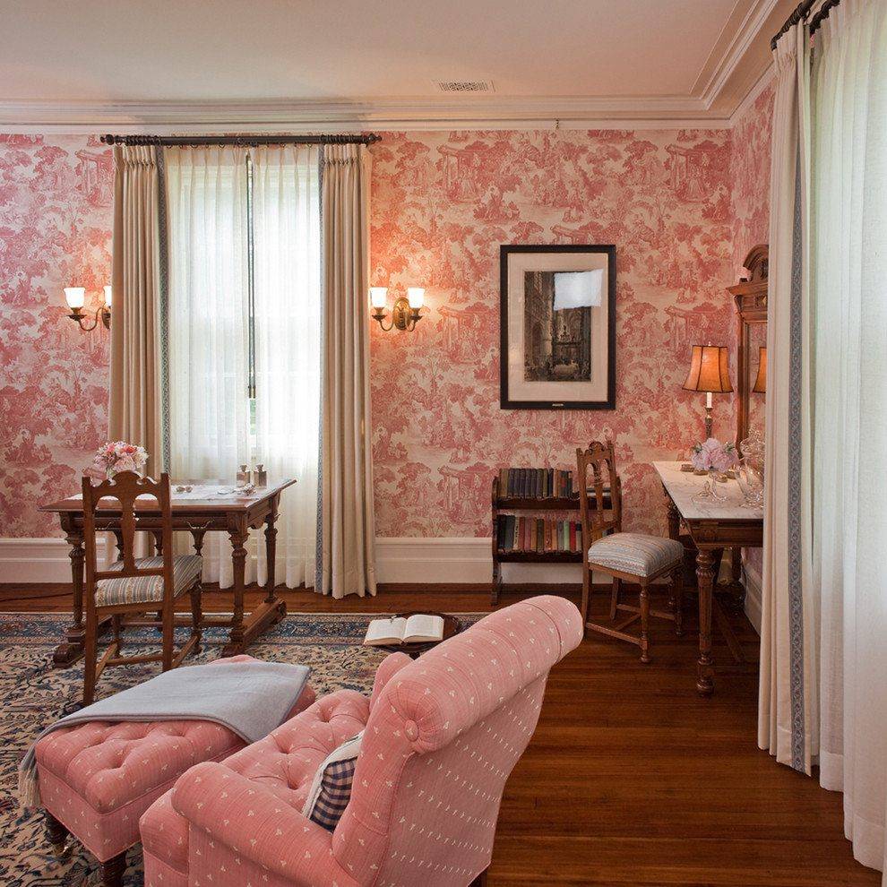 Нежный интерьер, созданный благодаря обоям различных оттенков розового цвета, необходимо дополнять шторами легкой текстуры, например тюля или органзы.