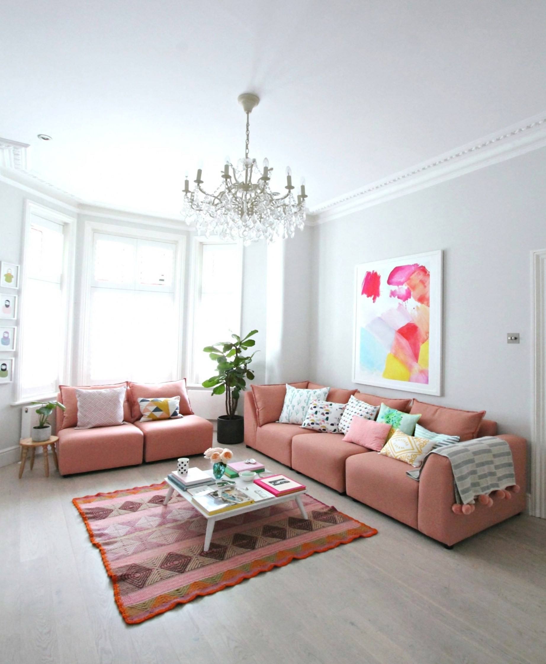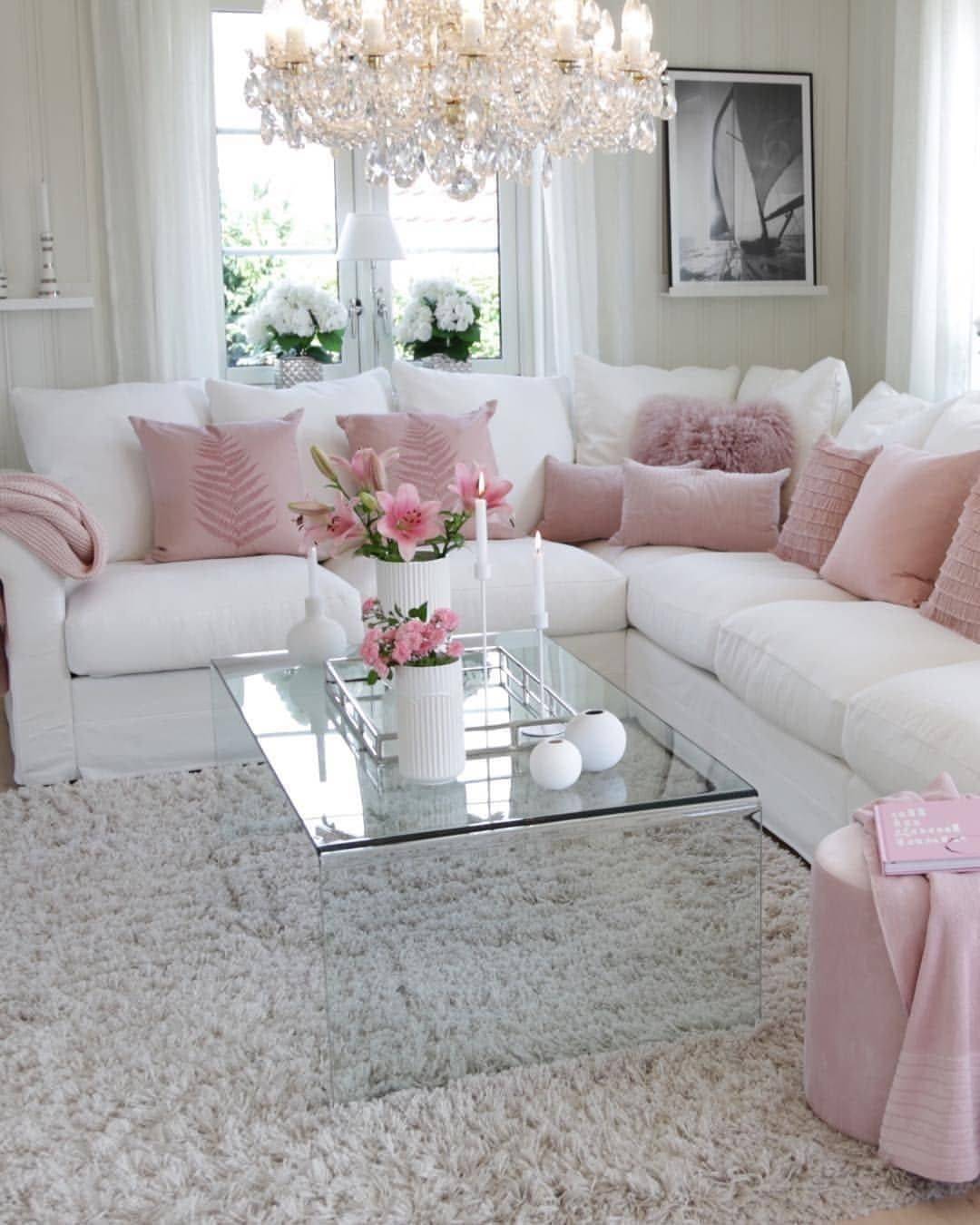Решением, безусловно, более простым и менее требовательным является использование мебели и аксессуаров в розовом цвете. Красивый уголок в скандинавском стиле или диван позволят вам привнести не только цвет, но и элегантность. Яркий предмет мебели на деревянных ножках кажется легким, что очень полезно, если вы не хотите розовый интерьер гостиной.