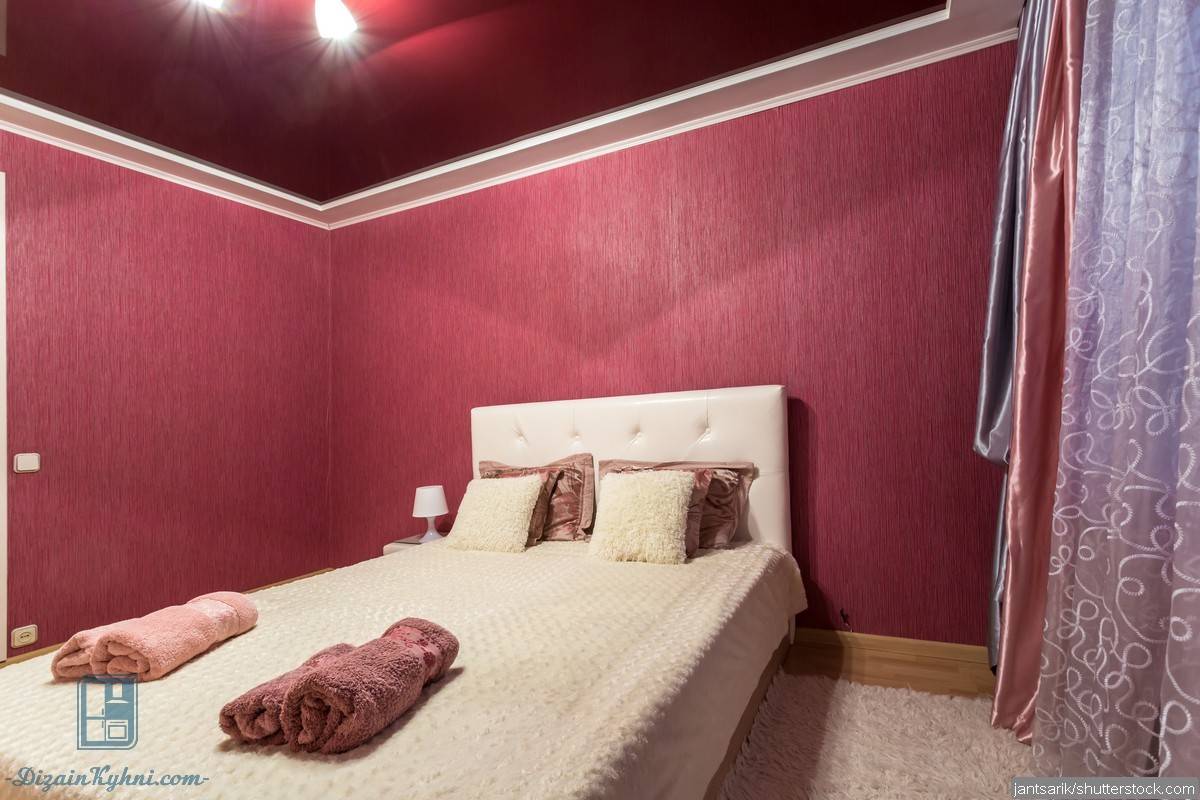 В этой комнате розовый и его оттенки будут весьма уместными. Даже мужчине понравится оформление помещения в приглушенных розово-бежевых, розово-персиковых тонах, пастельных и пепельных оттенках. Глянцевый натяжной потолок белого цвета прекрасно дополняется композицией из фотообоев на одной стене и скромными однотонными обоями на других стенах. Если потолки низкие, лучше использовать светлые обои-компаньоны, чтобы обеспечить эффект зонирования пространства.