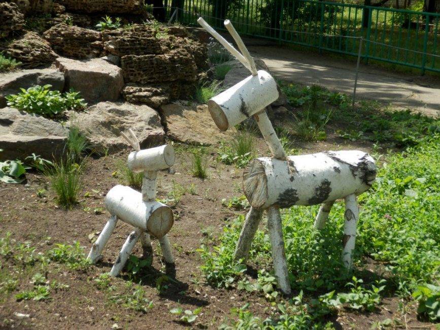 Чтобы сделать такую козочку, найдите два березовых бревнышка. Проделайте отверстия, в которые нужно будет загнать шею и 4 ножки. Подготовьте узкие палки для этих частей тела.