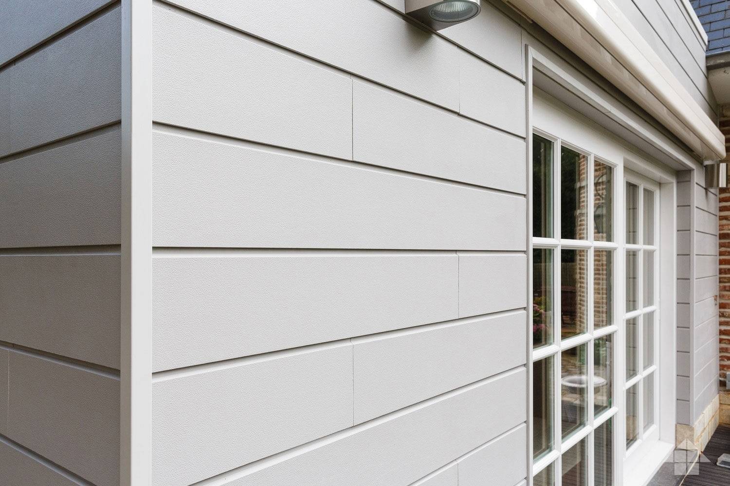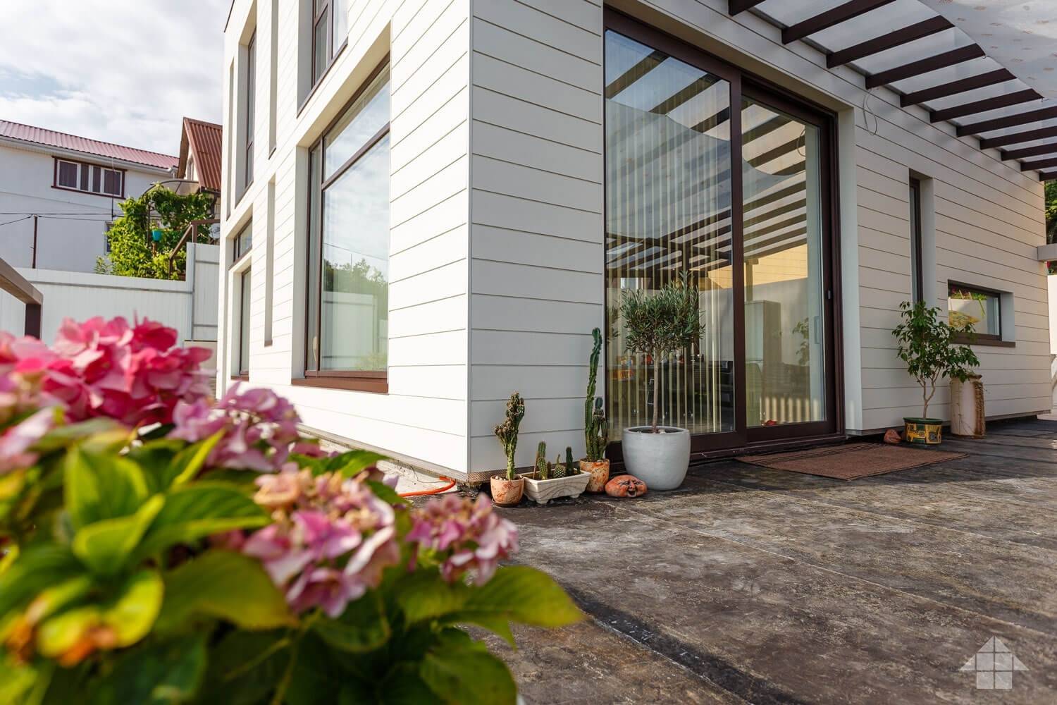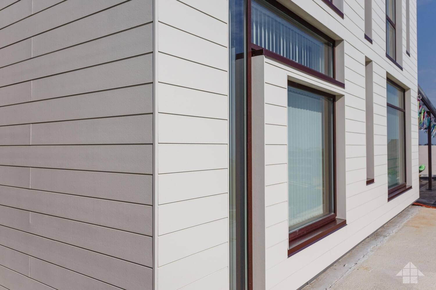 Углы, откосы и прочие элементы фасада можно выделить стандартными фиброцементным панелями, но уже другого цвета. Учитывая, что стоимость доборных элементов всегда выше стоимости основного материала, это позволит вам неплохо сэкономить.