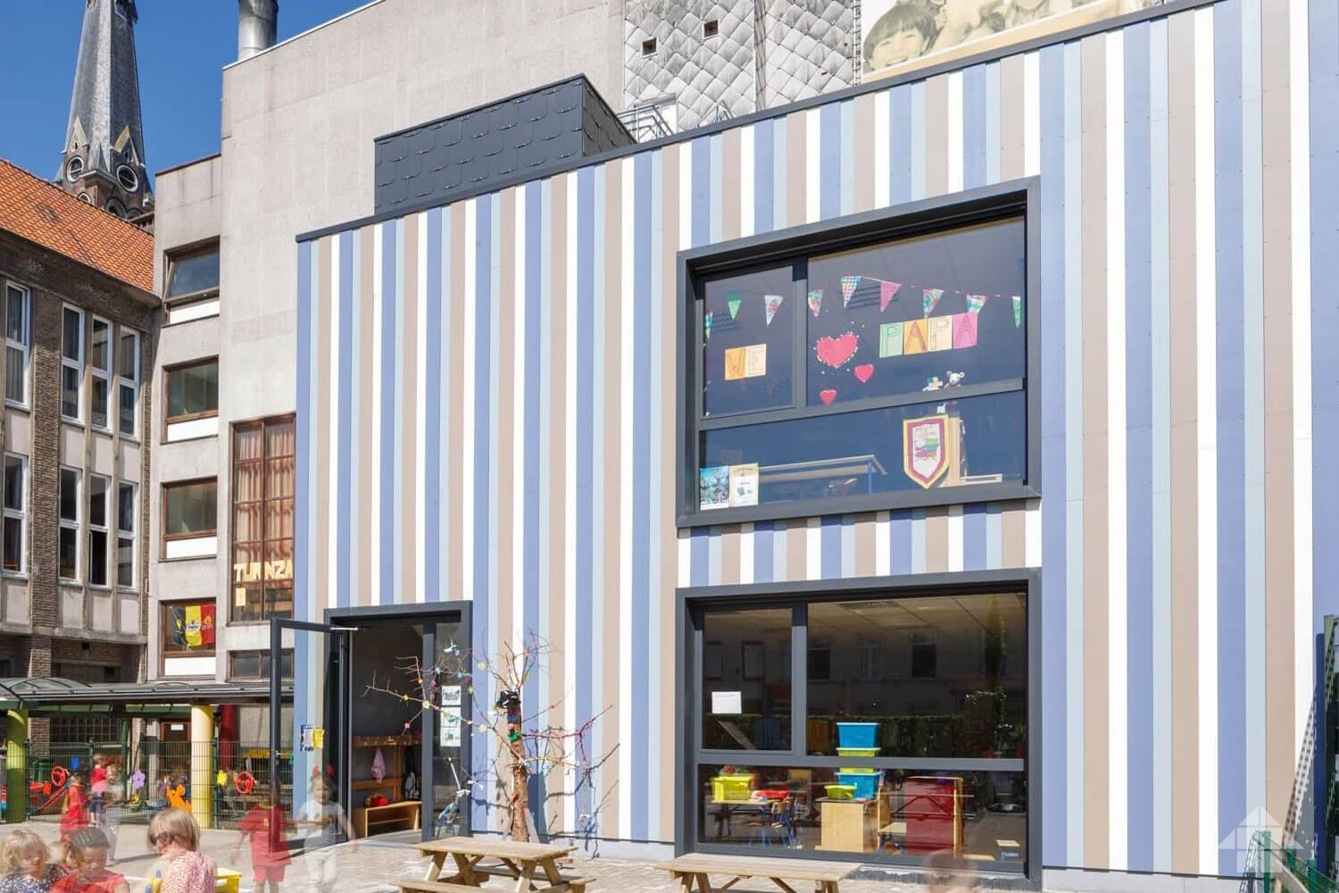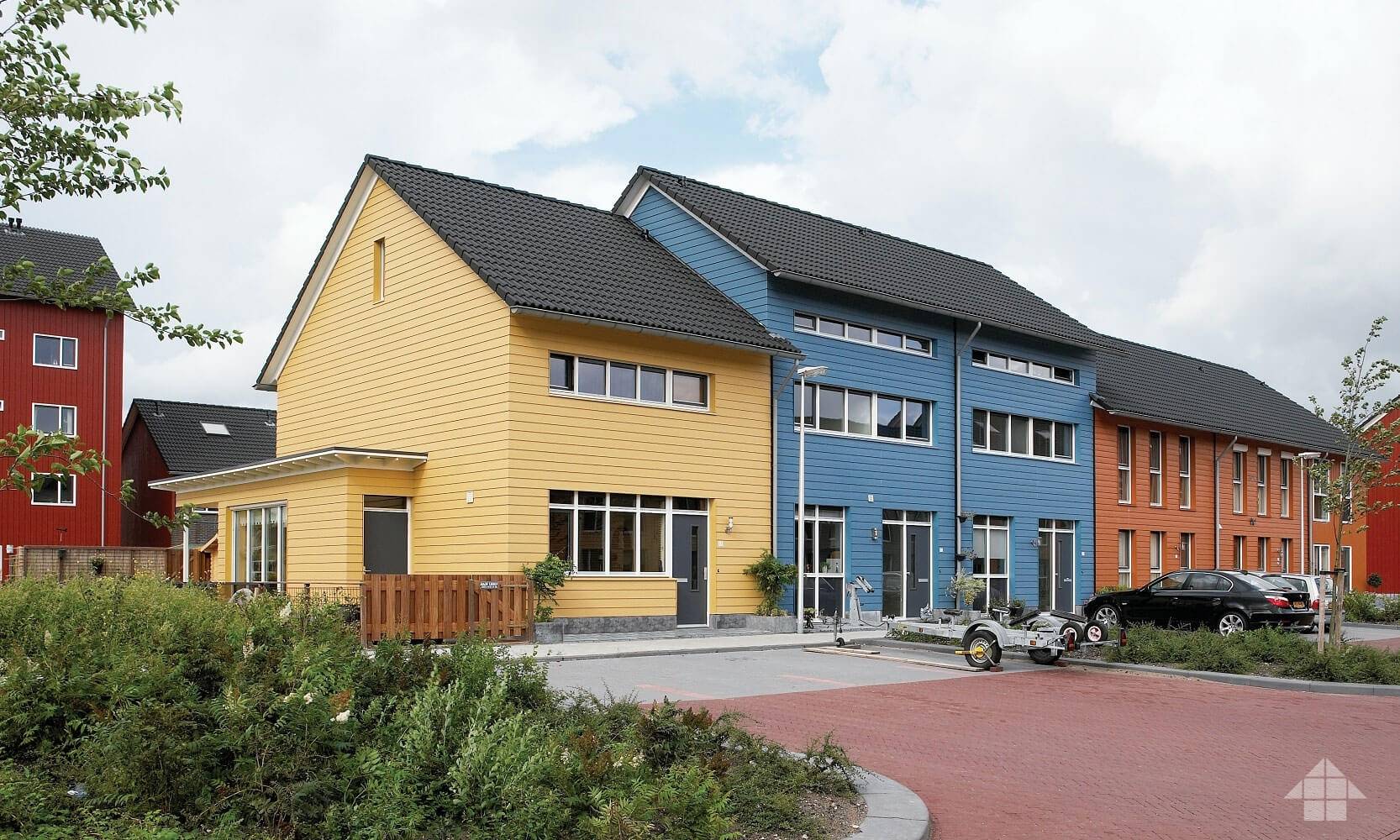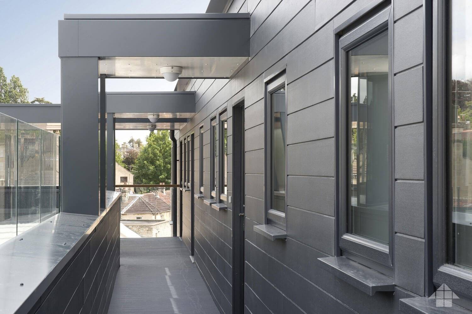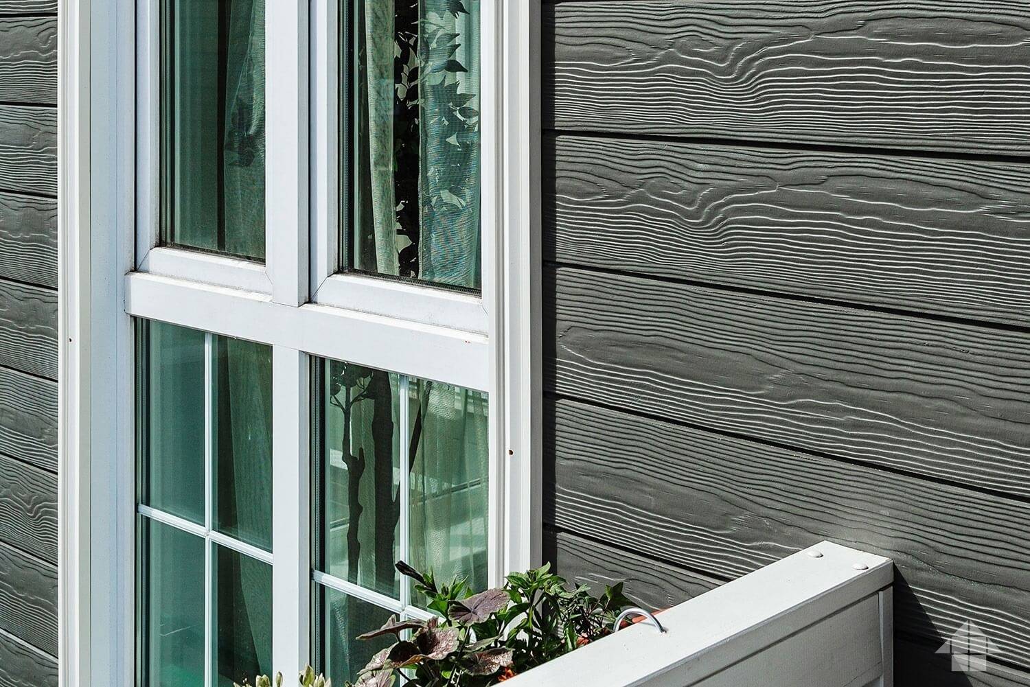 Углы, откосы и прочие элементы фасада можно выделить стандартными фиброцементным панелями, но уже другого цвета. Учитывая, что стоимость доборных элементов всегда выше стоимости основного материала, это позволит вам неплохо сэкономить.