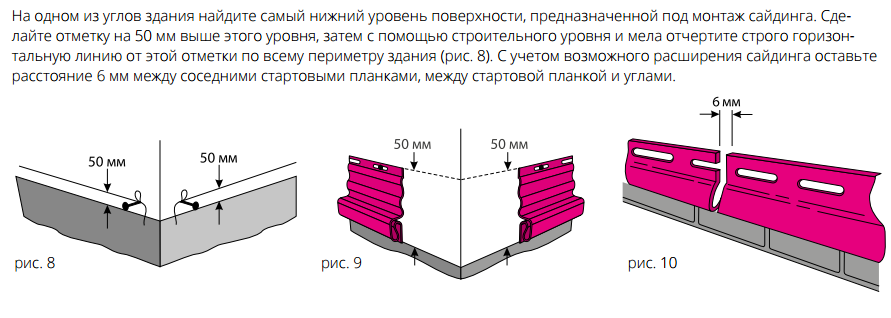 - Учитывайте величину, на которую удлинится панель при положительной температуре воздуха или под воздействием прямых солнечных лучей. Следовательно, если производится монтаж сайдинга с длиной соответствующей длине здания, то панель укорачивается из расчета 2 мм на один погонный метр винилового сайдинга. Панель устанавливается с равным удалением торцов сайдинга от углов здания.