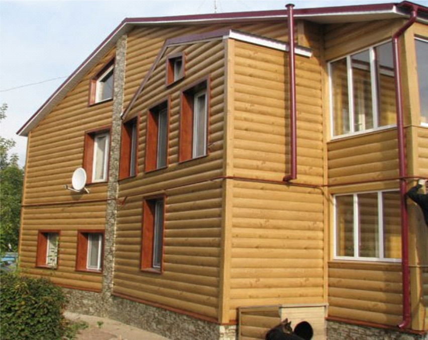 Использование металлических панелей под оцилиндрованное бревно позволяет самостоятельно придавать зданию эстетичный внешний вид, а также помогает нивелировать изъяны. Обшивка металлосайдинга не герметична, поэтому поверхность стен продолжает дышать, а комфортные микроклиматические условия в доме не изменяются. Разнообразие оттенков и фактуры панелей делают выбор отделочного материала очень богатым, а простота технологии монтажных работ не требует много времени и сил на обшивку даже значительной по площади поверхности.
