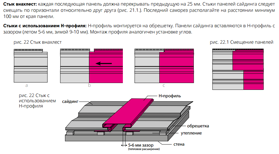 цветной шрифт — среднее удлинение сайдинга: зеленый цвет — нахлест. При монтаже сайдинга Деке соблюдайте тепловые зазоры, указанные цветным шрифтом.