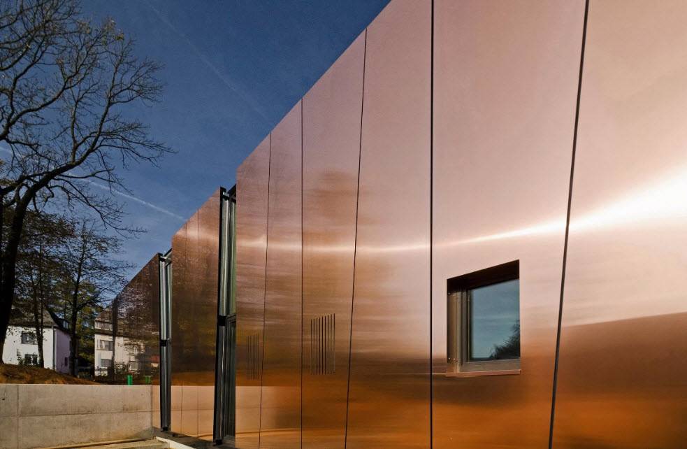 Также для металлической отделки дома могут использовать сплавы бронзы, меди и латуни. Панели, выполненные из этих видов металла, покрывают специальным лаком и оборудуют скрытой крепежной системой, внутри их обклеивают специальным материалом, поглощающим звук. Отдельно хотелось бы выделить влагостойкие и морозоустойчивые панели с полимерным покрытием, сэндвич-панели и металлокерамические стальные листы, покрытые стекловидной эмалью. Каждый из этих вариантов имеет свои достоинства и преимущества, а недостаток у них один – высокая стоимость.
