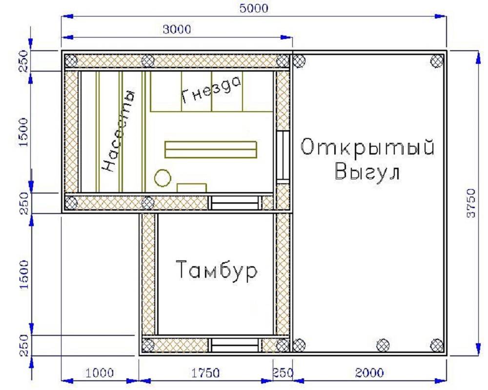 - размеры здания высчитываются исходя из того, что для комфортного проживания 3 птиц требуется 1 -1,5 м2 площади;