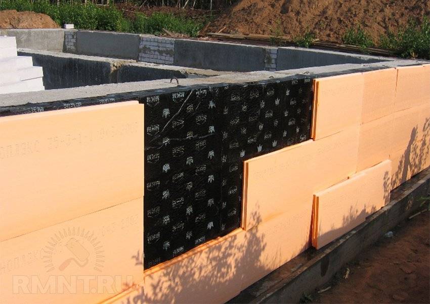 Решить проблему размораживания низкомарочного бетона также можно утеплением наружных поверхностей фундамента и отмостки. Используют для этих целей обычный недорогой ПСБ низкой плотности, который временно крепится к блокам поверх изоляции клеевым способом, а затем поддерживается грунтом обратной засыпки.