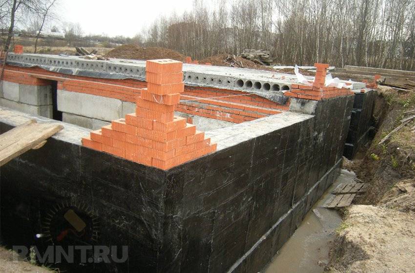 В общем случае изоляцию сборных фундаментов наносят наплавкой с использованием качественных полотен на основе из сшитого полипропилена или стеклоткани. В таком случае гидробарьеру нужно обеспечивать временное крепление в верхней зоне фундамента выше отметки УГВ, иначе велик риск её отслоения из-за атмосферных воздействий, ведь фундамент будет оставаться открытым практически до полного завершения строительства.