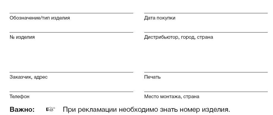 Занесите необходимые данные в гарантийный талон и храните его вместе с чеком-квитанцией. Кроме того, позаботьтесь о том, чтобы Ваш дистрибьютер поставил свою печать в предусмотренном для этого месте. При рекламациях обращайтесь пожалуйста в фирму, в которой Вы приобрели наше изделие.