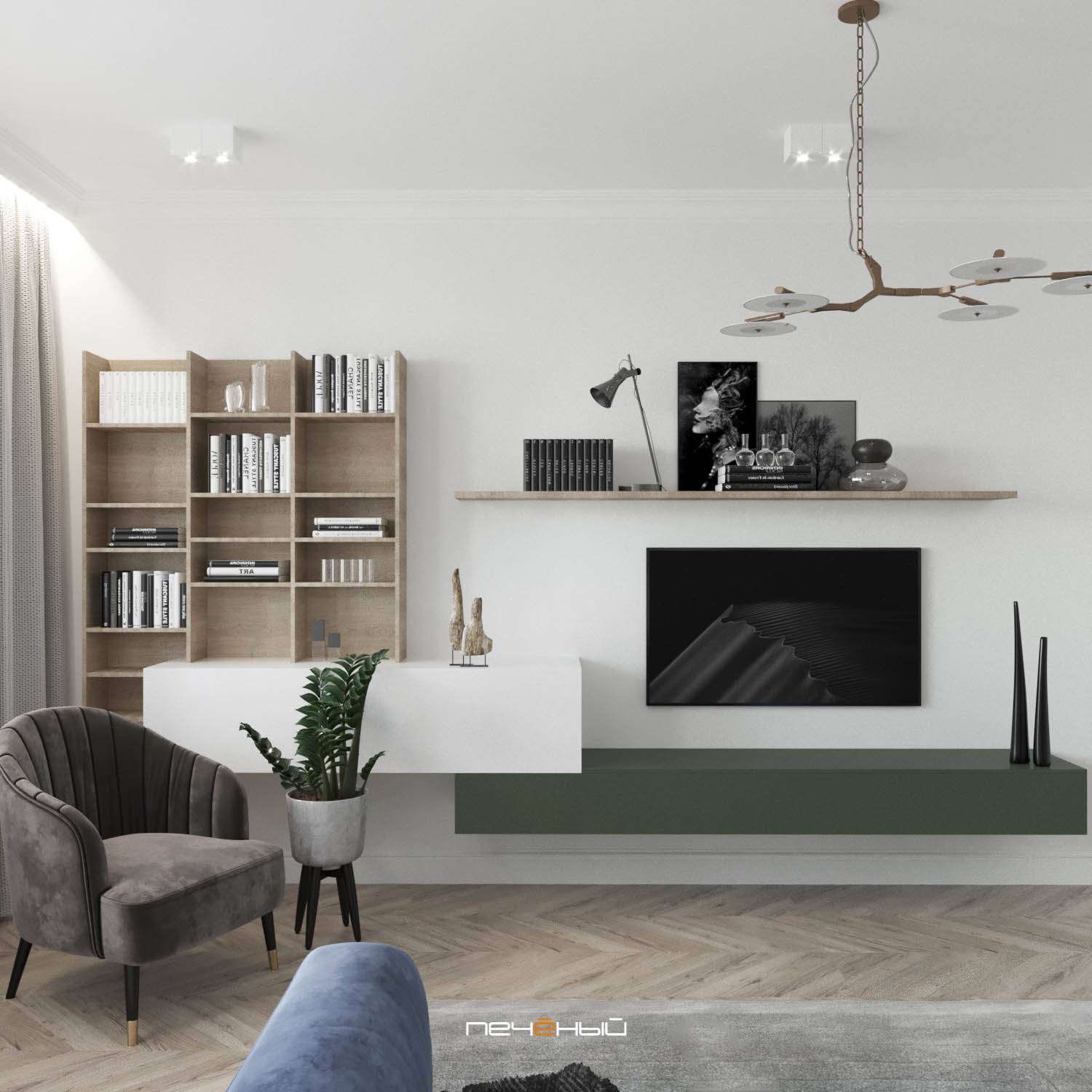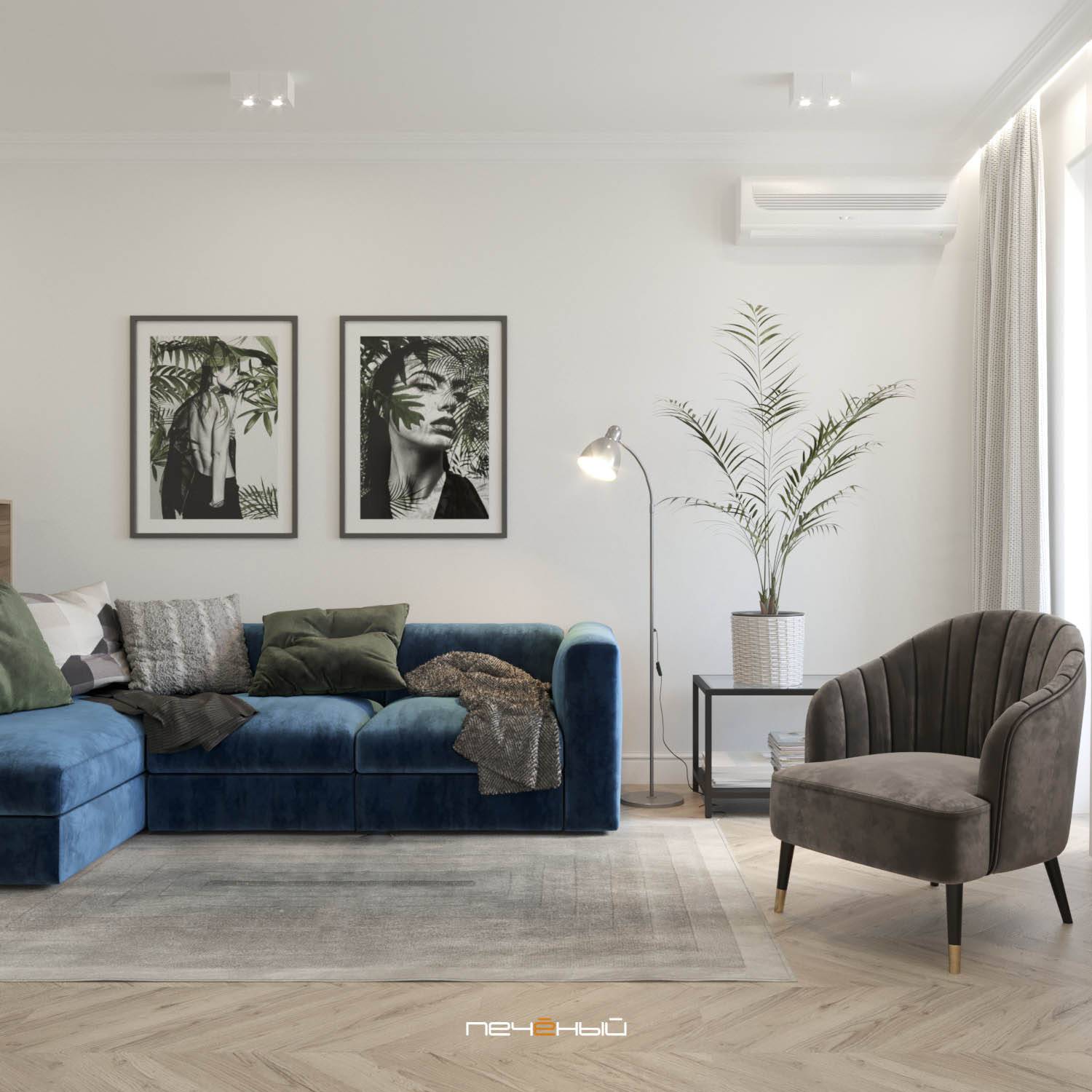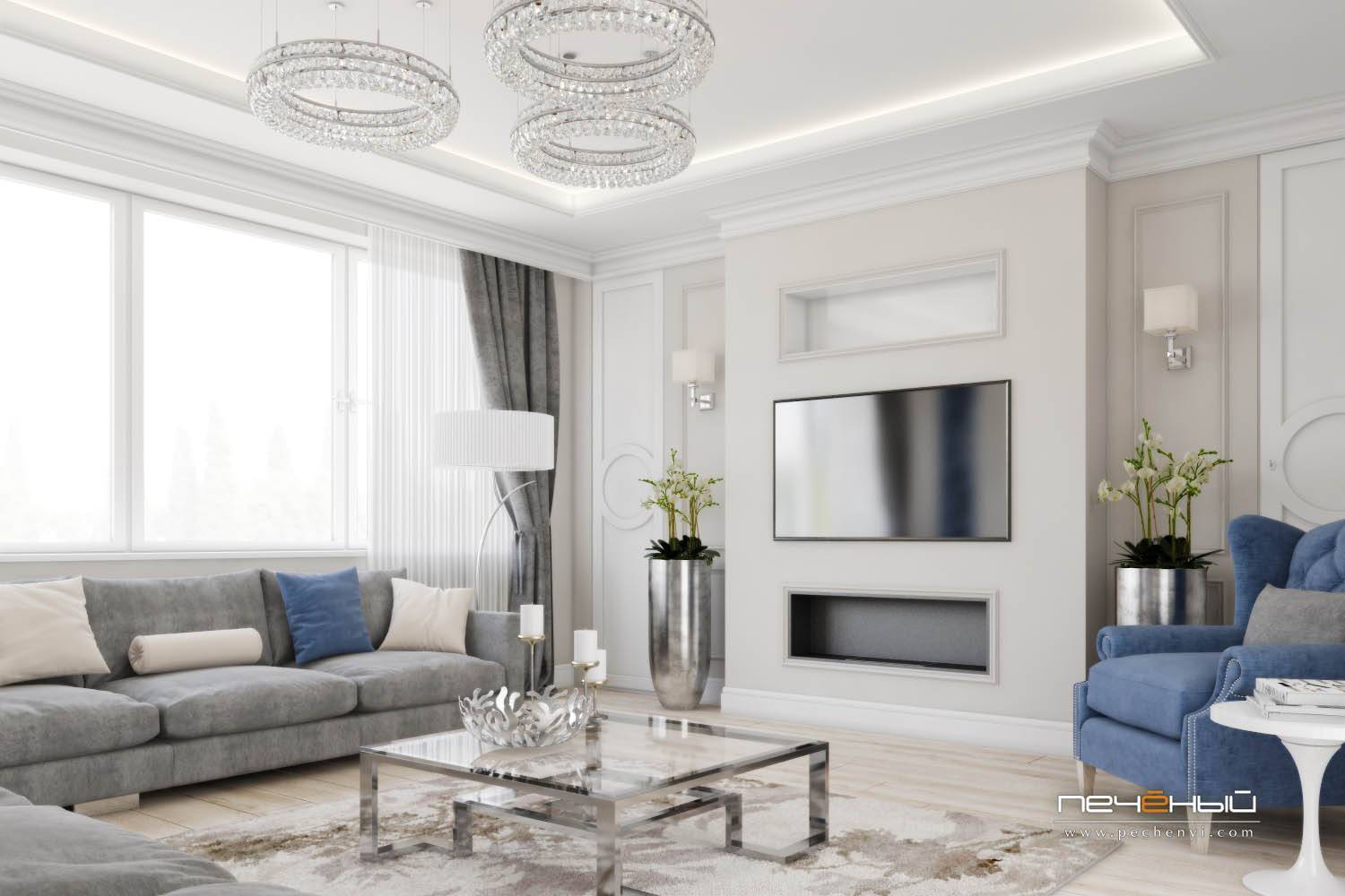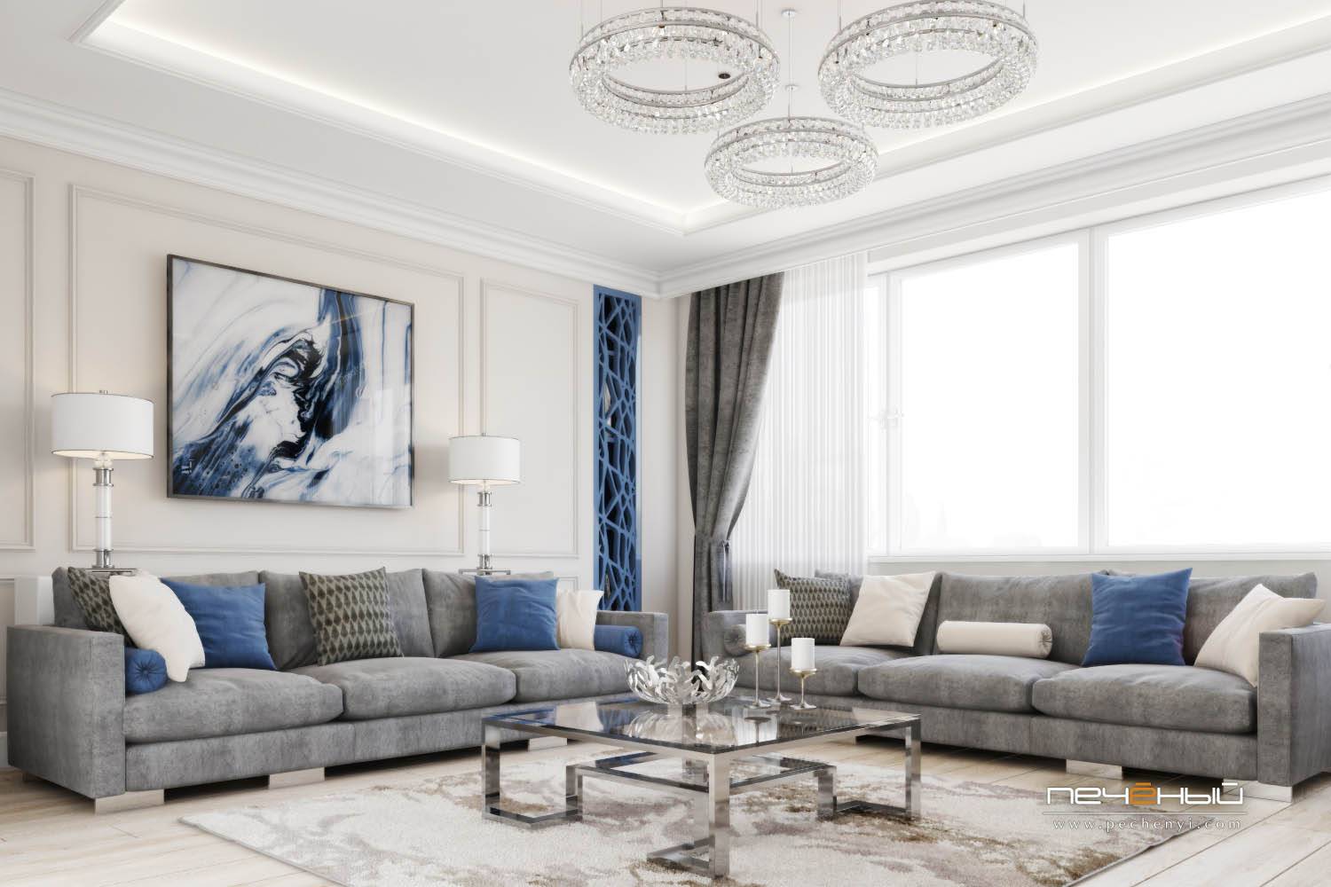 Ещё один вариант соединения в интерьере современной лаконичности и классической изысканности. Серо-синяя гамма тут очень уместна – она добавляет графичности и в целом, гостиная смотрится свежей и очень нарядной.