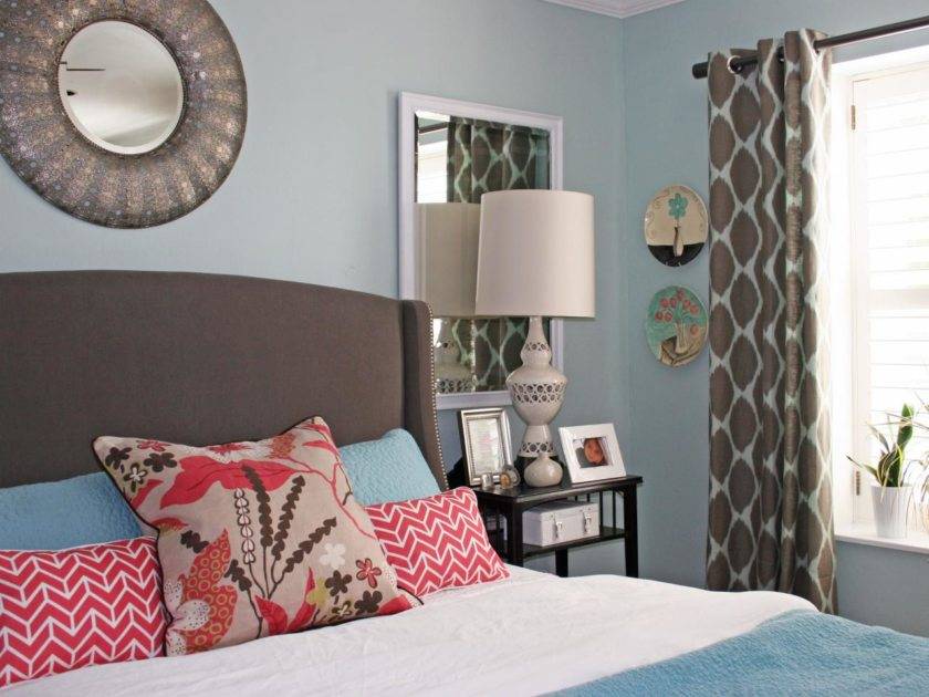 Светлые и нежно-голубые цвета позволяют создать в спальной комнате легкую и воздушную атмосферу и подчеркнуть изящность окружающего пространства.