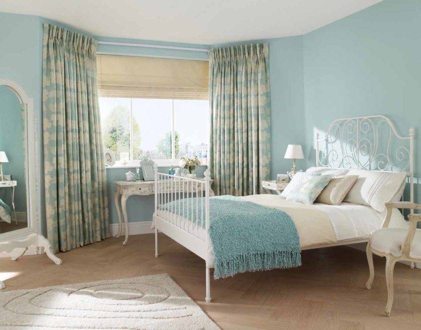 Очень эффектный вид имеют голубые шторы с принтом в виде строгой геометрии, растительных орнаментов или цветочных мотивов. Детскую в морской стилистике органично украсят бамбуковые занавески, а для современной спальни подойдут рулонные модели. Пол в комнате застилают васильковым ковролином или небольшим ковром разной формы, гармонично сочетающимся с покрывалом и подушками в подобной расцветке.