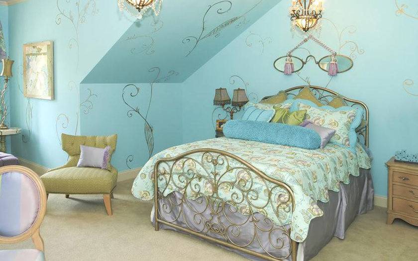 На фото голубой цвет в интерьере спальни для девочки в стиле прованс.