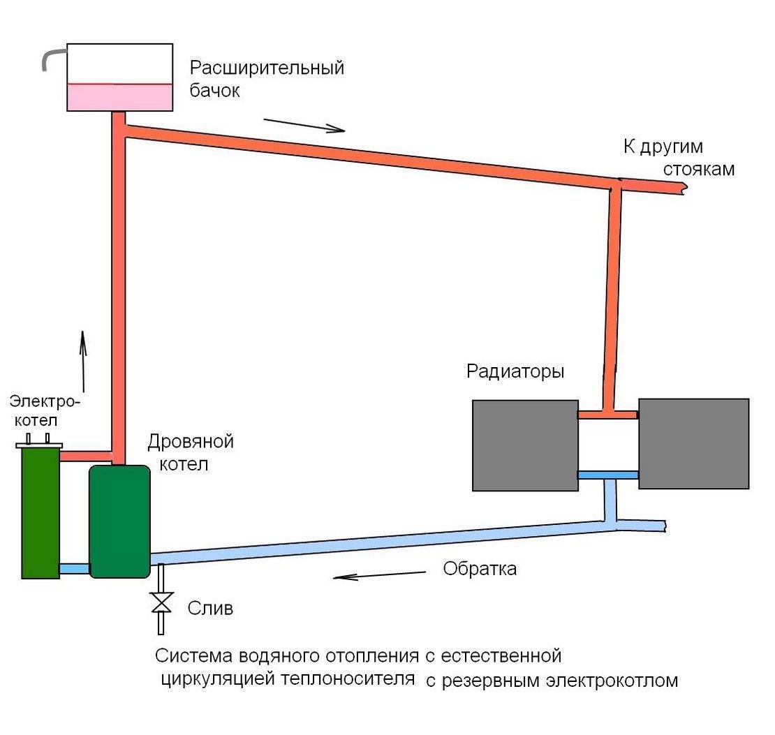 Закрытый резервуар для самотечной системы нежелателен. Имеющаяся в нем мембрана создает значительное сопротивление, которое трудно преодолевать. Правда, если отключат электричество, теплоноситель в гравитационной системе, сделанной с полным соблюдением технологии, все равно будет перемещаться, хотя и не с такой интенсивностью. Классическая схема закрытой системы – мембранный бак плюс циркуляционный насос, самотечной – уклон труб и открытый бачок.