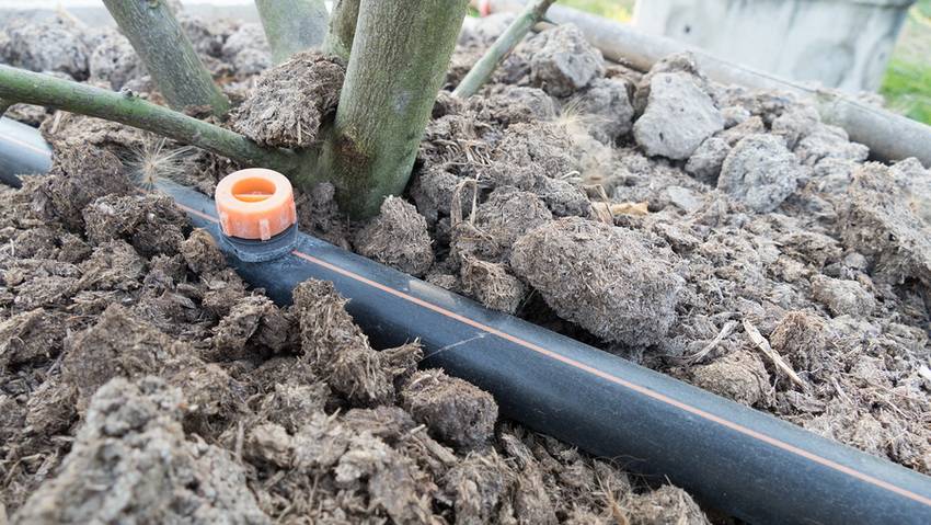 Внутрипочвенное орошение – более сложный способ полива. Своими руками сделать его будет крайне сложно, да и используется оно, в основном, для полива определенных насаждений или декоративных деревьев. По своему принципу такая система работает, как капельное орошение, только трубы, снабженные мелкими отверстиями, через которые подается вода в почву, вкапываются в непосредственной близости к посадкам. Пример показан на фото. Вода поступает непосредственно к корням, не намачивая при этом поверхность почвы. Соответственно, корки на земле после этого не образуется, а корневая система растений сможет в полной мере получать кислород.