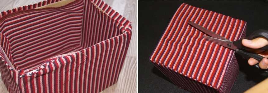 Края обоих мешочков подворачиваем внутрь, обшиваем коробку по периметру вручную.