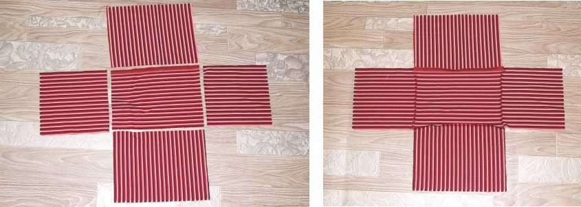 В этом случае все углы коробки можно проклеить скотчем с двух сторон — дольше служить будет. Далее берем ткань и вырезаем по размерам коробки два комплекта заготовок. Один строго по размерам, плюс припуск на швы, второй на 1 см меньше и тоже с припуском. На швы добавляем по 0,5-1 см с каждой стороны. Можно раскроить заготовку сразу с виде креста, но так расход ткани получается больше — отдельными кусками экономнее))