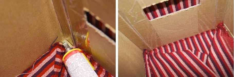 Теперь берем универсальный клей и приклеиваем ткань по периметру дна внутри и снаружи. Затем проклеиваем по углам. Так ткань не будет смещаться.