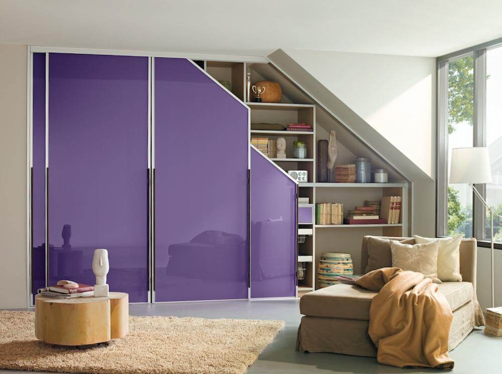 - Встроенная мебель. В число популярных входит как трапециевидная модель (с двумя скосами в верхней части), так и модели с одним скосом, или угловые. Дверные полотна повторяют форму конструкции — боковые фасады имеют скосы.