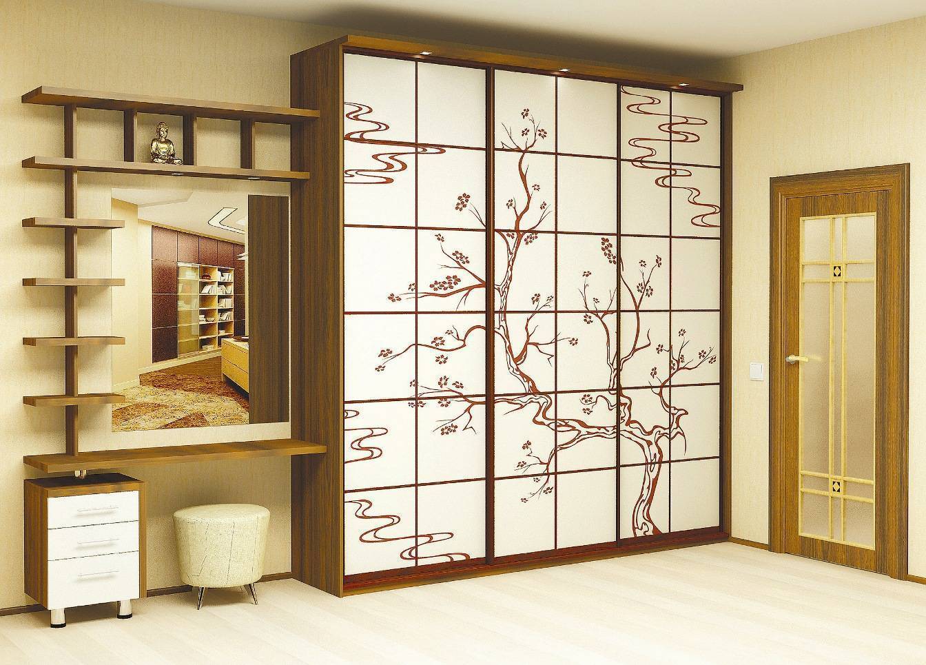 Горизонтальное деление — широко применяемый приемСразу три фактуры — ДВП, зеркало и пескоструйный рисунокТакой шкаф купе для прихожей с вешалкой и тумбой удобенИнтересная комбинацияПросто зеркальная поверхность делает маленькое помещение более просторнымВстроенный шкаф купе в прихожую с интересными дверкамиРисунок в восточном стилеШкаф купе с подсветкой — удобноРадиальные шкафы смотрятся интересноСочетание коричневых цветов и разных фактурРастительный орнамент — одна из распространенных темИмитация деревянной поверхности, но необычная комбинация с разным направлением «волокон»Рисунок на стекле в восточном стилеПросто и со вкусом — матовое стекло с горизонтальным делениемИспользовать даже пространство над дверьми — хорошая идея для маленькой прихожейУгловые шкафы для прихожей: использовать доступную площадь по максимуму