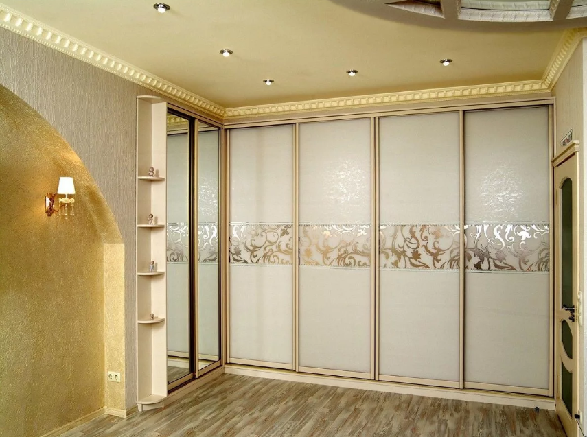 Для отделки шкафов-купе есть много различных вариантов – резные карнизы, кожаные элементы, фрески, витражи. Прекрасно смотрятся шкафы с зеркальной поверхностью. Отражая свет, зеркало приобретает способность увеличивать и освещать пространство. Несомненным плюсом зеркальной поверхности является и то, что на нее можно легко нанести пескоструйный рисунок. Сразу стоит отметить, что не будут уместны объемные цветы, четкие абстракции, девизы и слоганы.