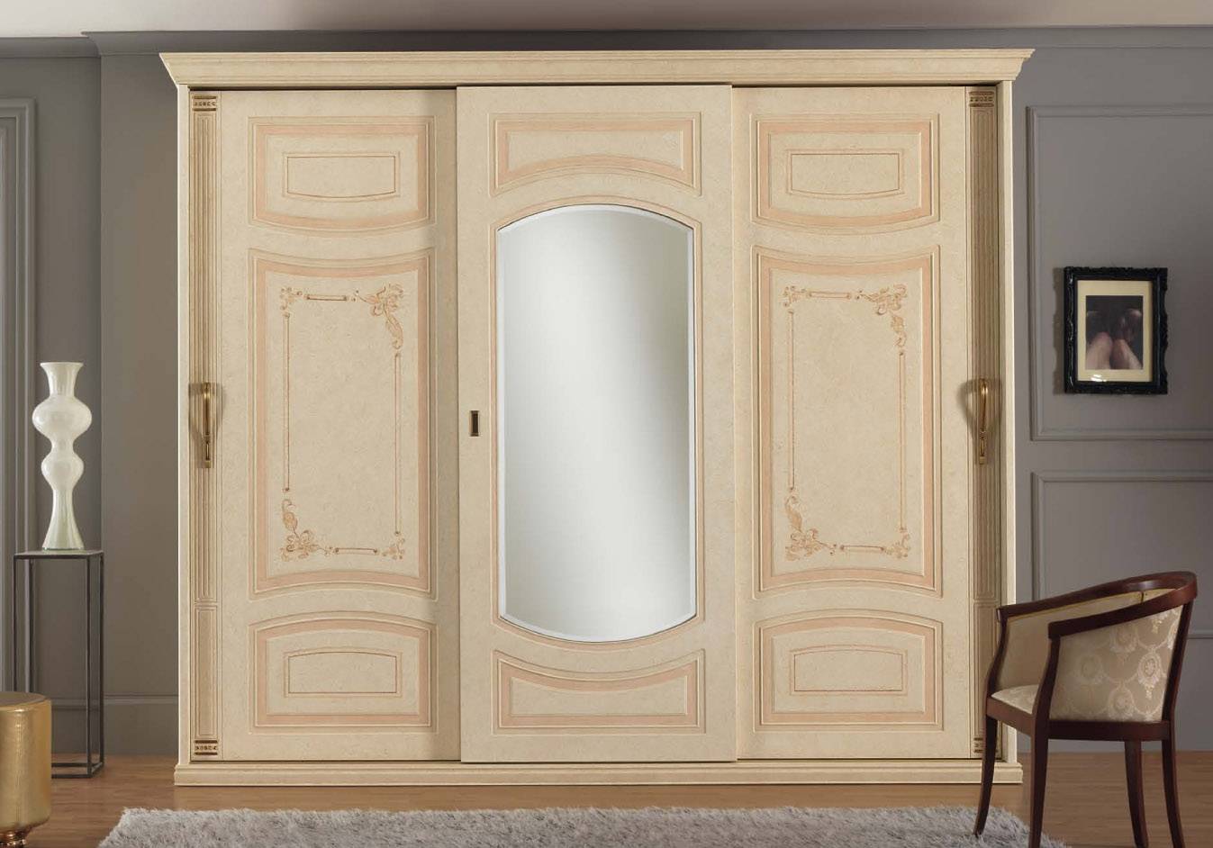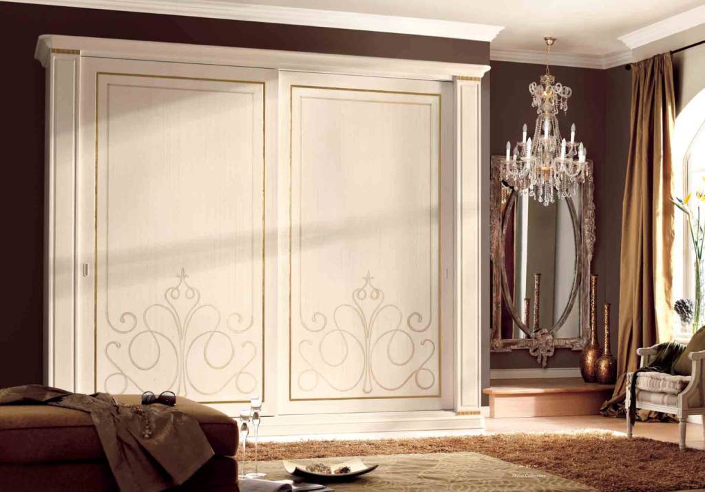 В качестве рисунка для классического шкафа-купе хорошо смотрятся мелкие цветы, ажурная окантовка, лаконичные плавные абстракции, природные мотивы. Хорошим решением станет и цветной пескоструй в серебряных или золотых оттенках. Можно эффектно сделать цветную «рамку» вокруг зеркальной поверхности, а можно и оттенить некоторые элементы узора. Дополнить такие рисунки смогут резные карнизы или тонкие изящные фрески.