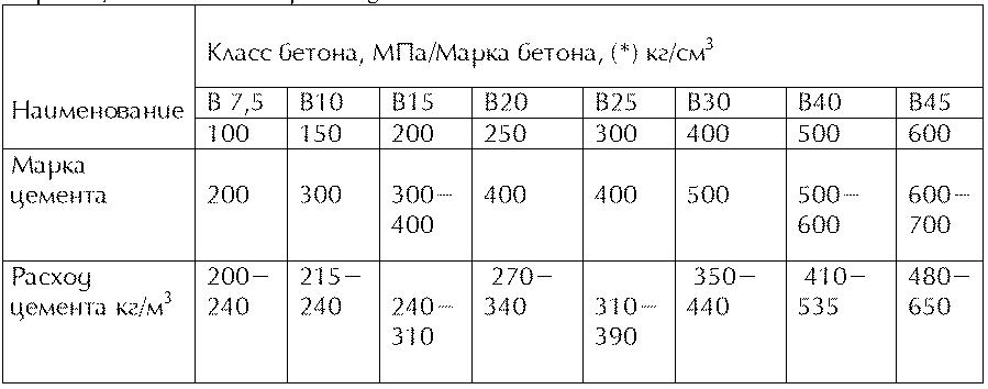 Для получения бетона требуемого класса по прочности на сжатие, рекомендуется использовать следующие марки и количества цемента:
