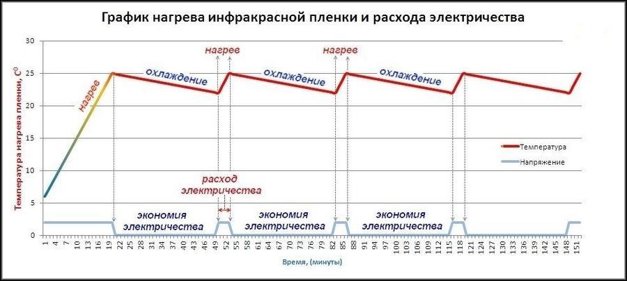 Представленные цифры действительны при круглосуточной работе пленочных теплых полов, но на практике они работают в прерывистом режиме, повинуясь системе терморегуляции.