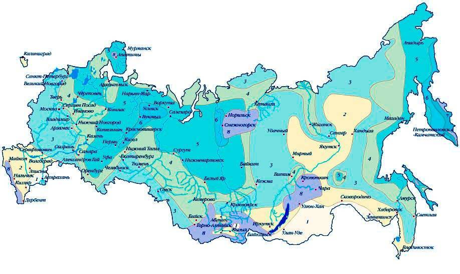 На карте указаны зоны с одинаковым уровнем снеговой нагрузки