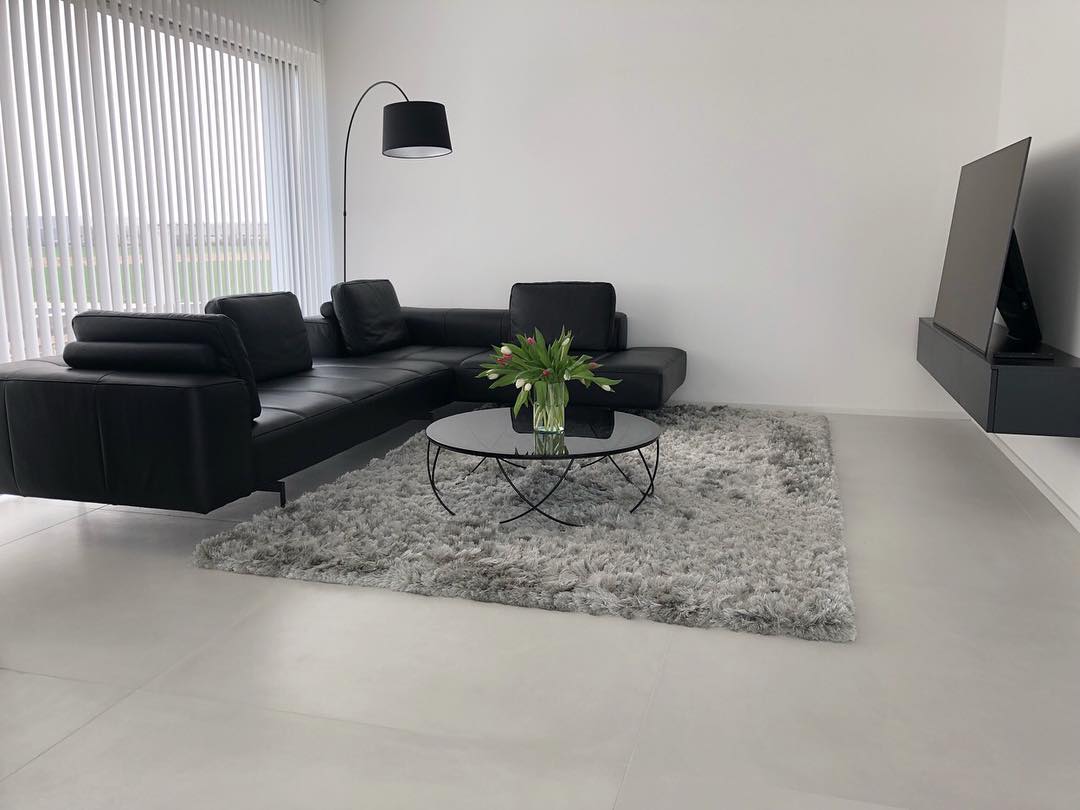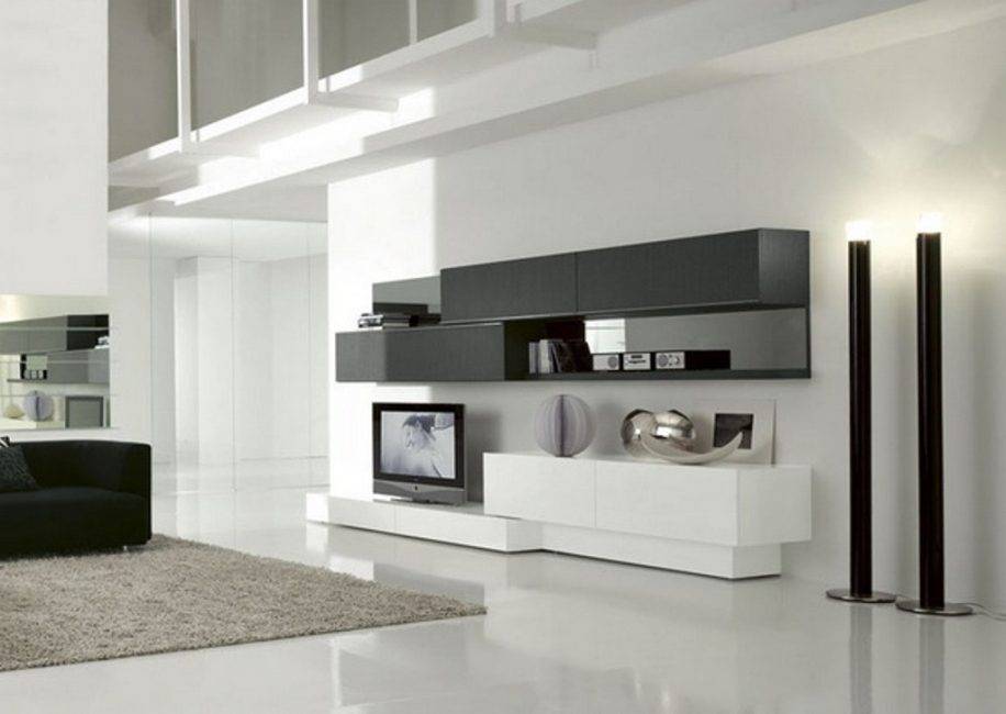 Для контраста с такой конструкцией используют белоснежный пол, отделанный керамической плиткой или натуральным камнем. Такая гостиная 2021 станет более «живой», если украсить ее комнатными растениями, расставленными на стеллажах. Однако не следует перебарщивать с их количеством.