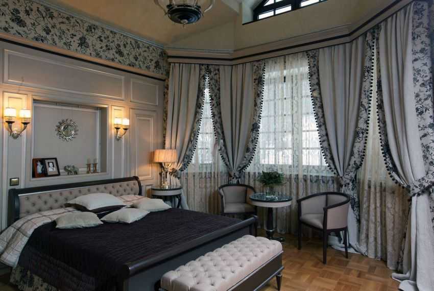 - пышные конструкции с ламбрекеном и двумя-тремя видами штор скорее не подойдут спальням с большим количеством предметов и декора.